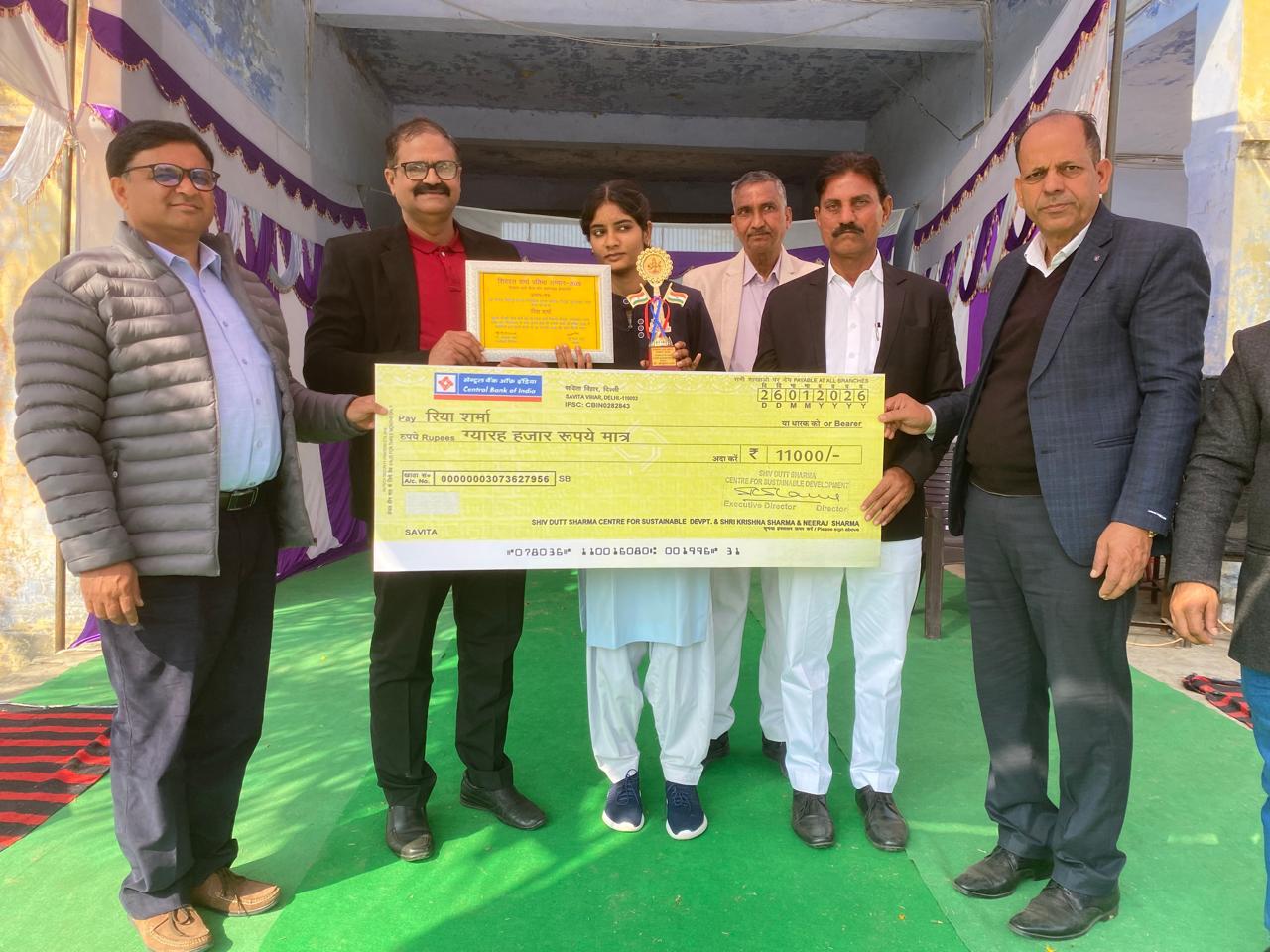 Saidpur, Bulandshahr, Uttar Pradesh. The Shivdutt Sharma Talent Award 2025 was presented to Riya Sharma, daughter of Mrs. Rita Sharma and Mr. Naresh Sharma, resident of Saidpur village, Bulandshahr district, Uttar Pradesh. She was honored with this award by Dr. Shrikrishna Sharma, Executive Director of the Shivdutt Sharma Center for Sustainable Development, at a ceremony held on January 26, 2026, at Military Heroes College, Saidpur,